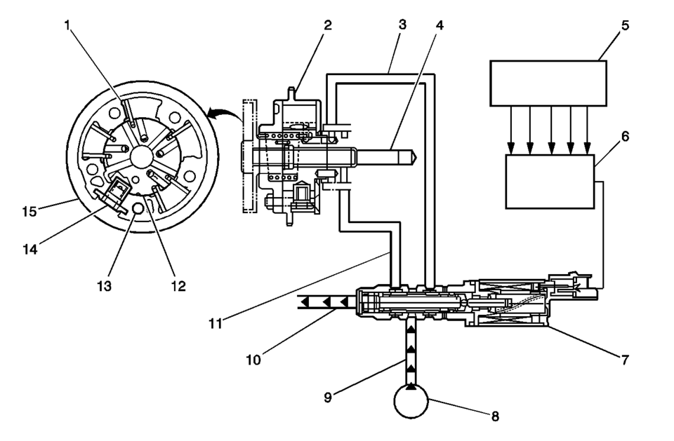 The CMP actuator solenoid valve (7) is controlled by the ECM. The crankshaft position (CKP) sensor and the CMP sensors are used to monitor changes in camshaft positions. The ECM uses the following information in order to calculate the desired camshaft positions: