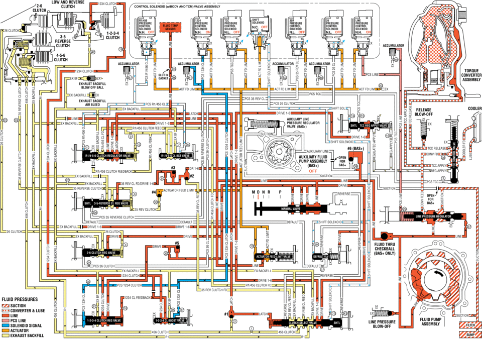 Shift solenoid fluid is exhausted from the clutch select valve and clutch select valve spring force moves the valve to the released position. This allows R1 fluid pressure to pass through the valve into the exhaust backfill circuit. Drive fluid from the manual valve passes through the clutch select valve and enters the drive 1-6 fluid circuit. Drive 1-6 fluid is routed to the R1/4-5-6 clutch regulator valve, the 3-5-reverse clutch regulator valve, and the TCC regulator apply valve.