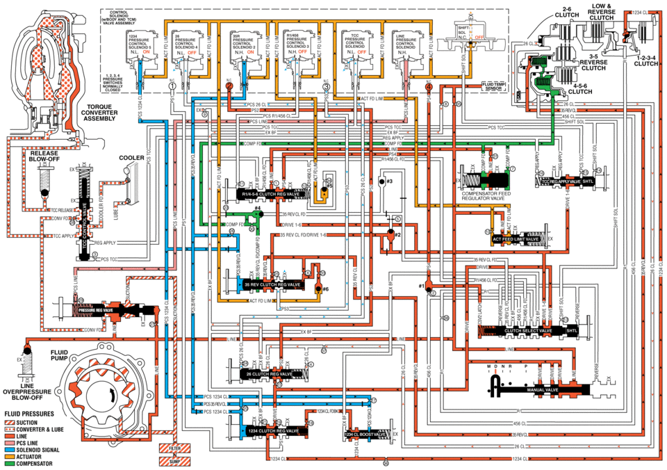 #6 Ball Check Valve 35 reverse clutch feed fluid unseats the #6 ball check valve, allowing excess pressure to pass into the actuator feed limit circuit. This helps to control clutch apply fluid pressure and clutch apply feel.