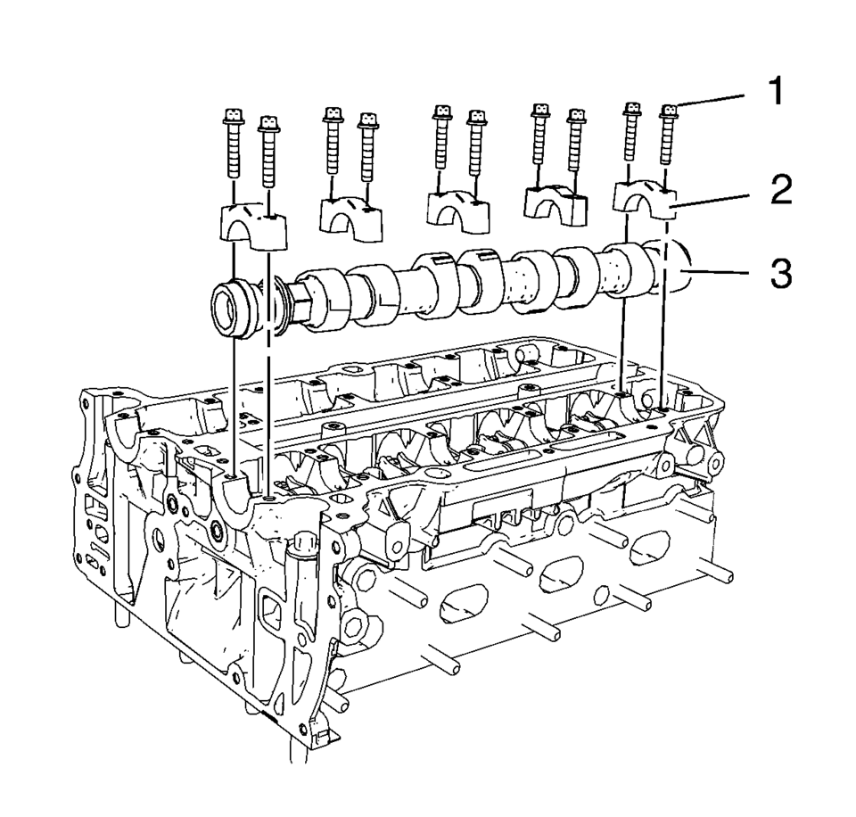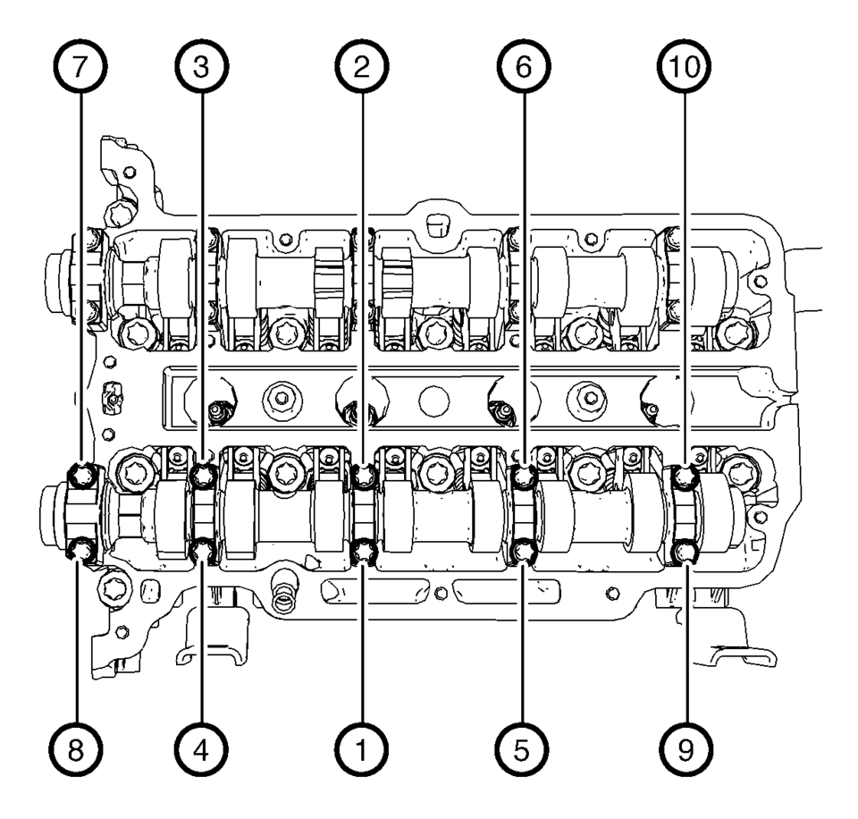 Tighten the camshaft bearing cap bolts one turn at a time in order to avoid shape distortion of the camshaft.