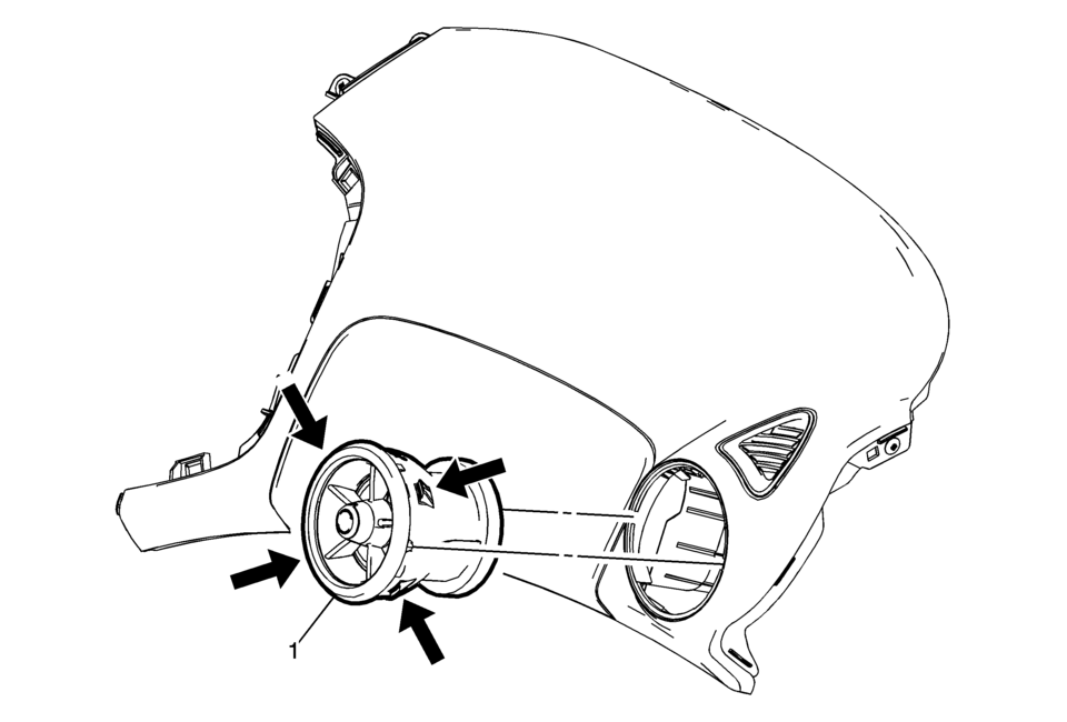Remove the air outlet assembly by pressing the 4 securing tabs from the inside of the upper trim panel. |