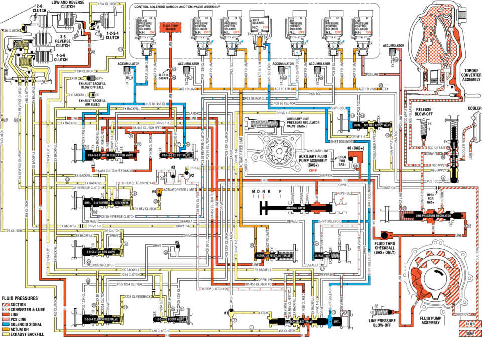 PCS 35 reverse clutch fluid exhausts, allowing 3-5-reverse clutch regulator valve spring force to move the 3-5-reverse clutch regulator valve to the released position. This allows exhausting 35 reverse clutch fluid pressure to pass into the exhaust backfill circuit in order to assist the 3-5-reverse clutch piston spring to quickly release the 3-5-reverse clutch.