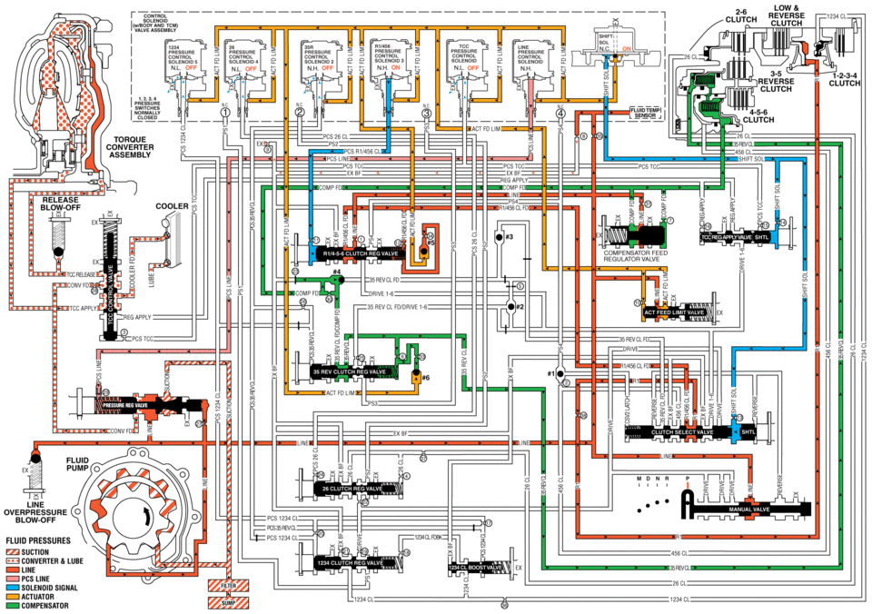 R1/456 clutch feed fluid unseats the #5 ball check valve, allowing excess pressure to pass into the actuator feed limit circuit. This helps to control clutch apply fluid pressure and clutch apply feel.