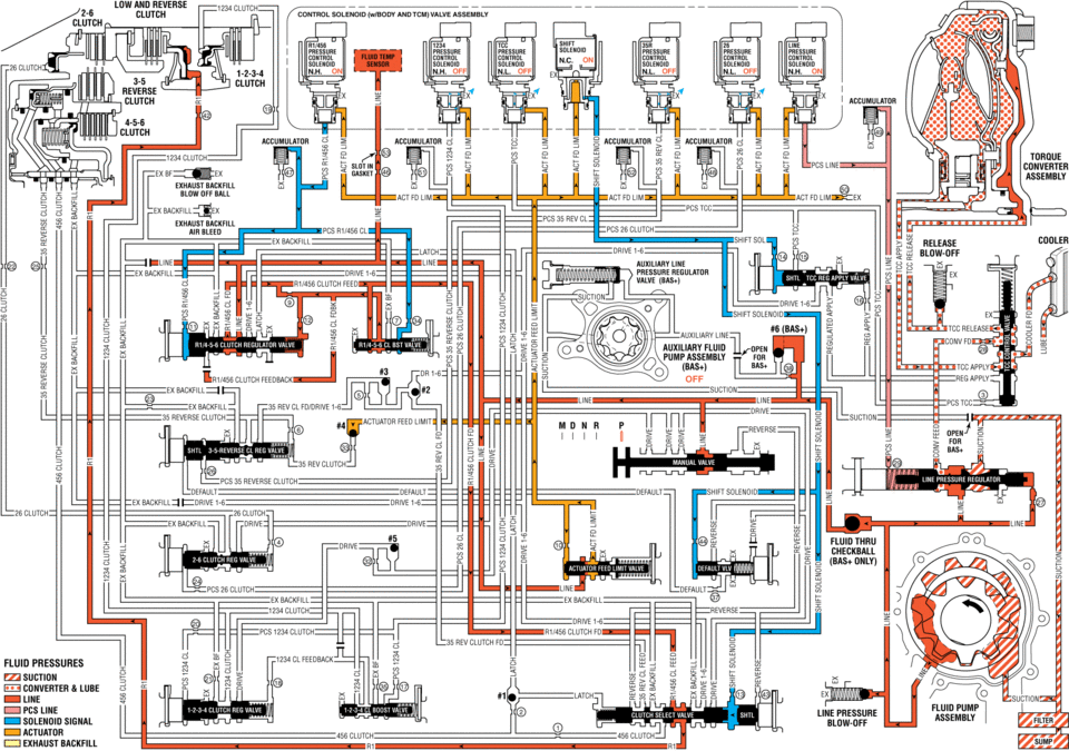 When the gear selector lever is in the Park (P) position, fluid is drawn into the pump through the transmission fluid filter assembly. Line pressure is then directed to the following valves: