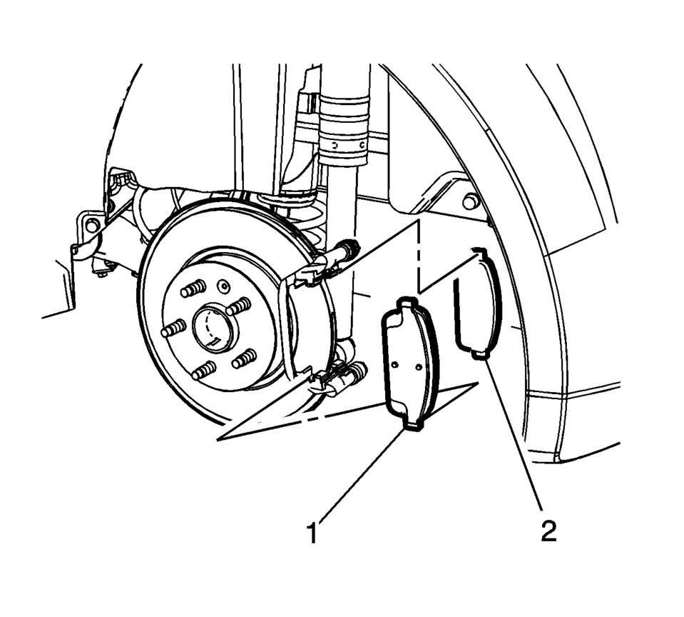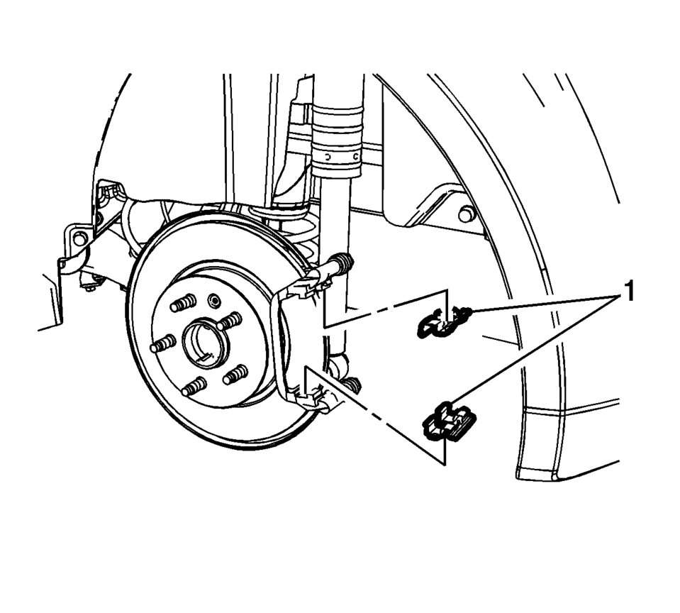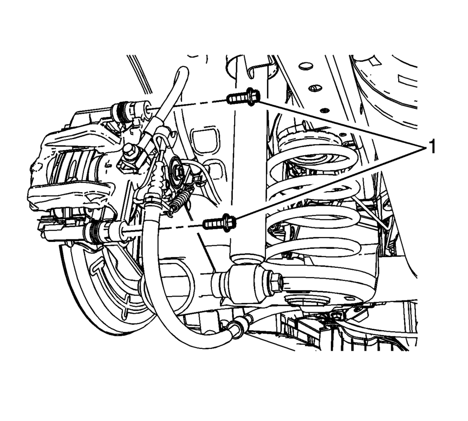 Support the brake caliper with heavy mechanic wire, or equivalent, whenever it is separated from its mount and the hydraulic flexible brake hose is still connected. Failure to support the caliper in this manner will cause the flexible brake hose to bear the weight of the caliper, which may cause damage to the brake hose and in turn may cause a brake fluid leak.