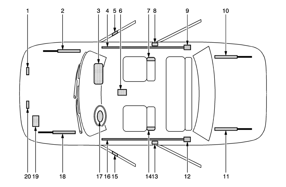 | (4) | Right Roof Rail Air Bag - Located under the headliner, extending from the passenger front windshield pillar to the passenger rear windshield pillar |