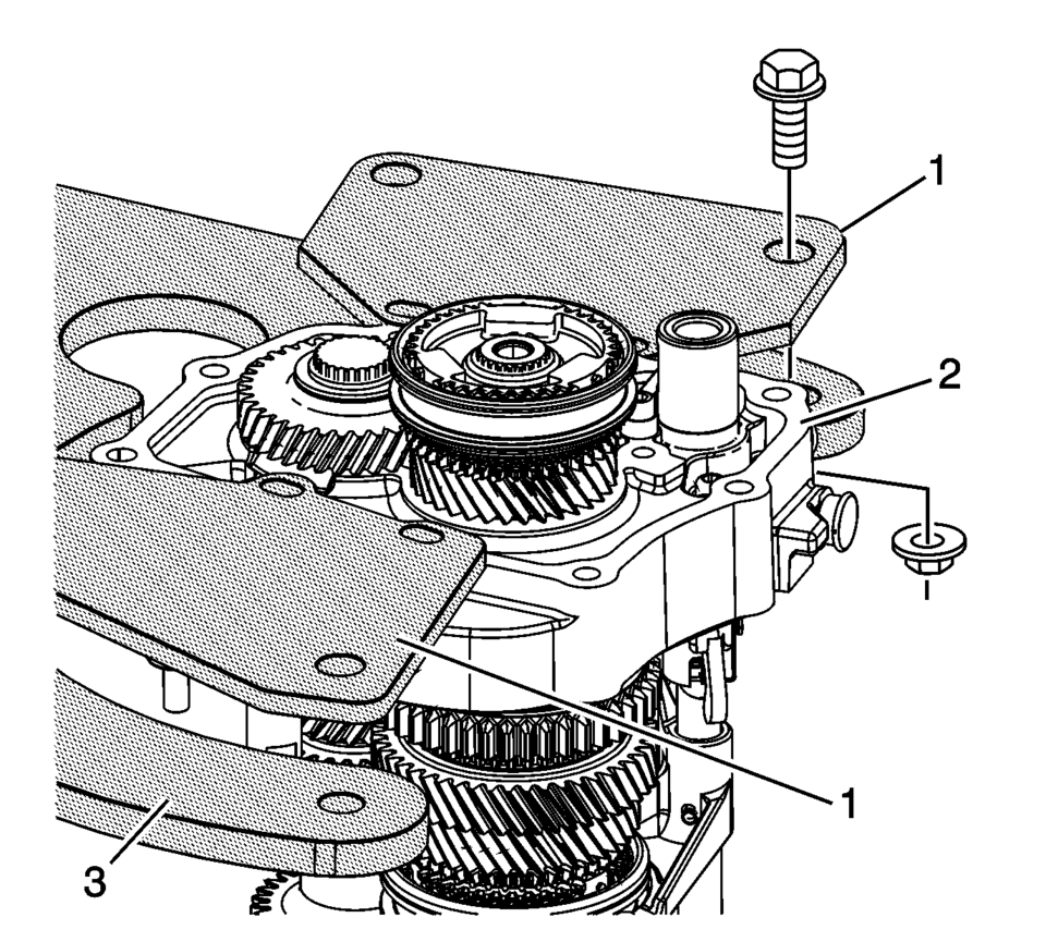 Using thread locking compound install the parking pawl retaining bolts (1) and